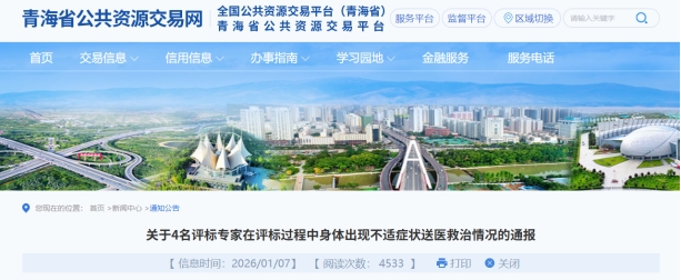 近日,青海省数据局在青海省公共资源交易网发布《关于4名评标专家在评标过程中身体出现不适症状送医救治情况的通报》。
